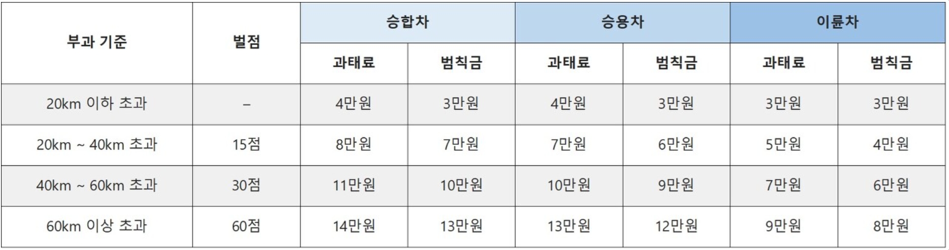 속도위반 과태료의 범칙금, 과태료 입니다. 속도위반시 보통 얼마만큼의 속도를 어겼느냐에 따라 구분됩니다. 승합차, 승용차, 이륜차 별 속도위반 과태료를 확인해보시기 바랍니다.