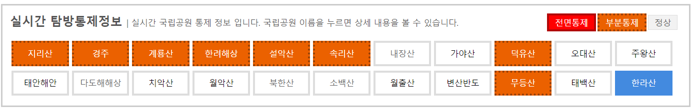 전면 통제는 빨간색, 부분통제인 곳은 지리산, 경주, 계룡산, 한려해상, 설악산, 속리산, 덕유산 무등산 등인데요 내가 등산을 가기 전 아래와 같이 부분통제 하고 있는 것을 미리 체크 후 떠나시는 것을 권장 드립니다.