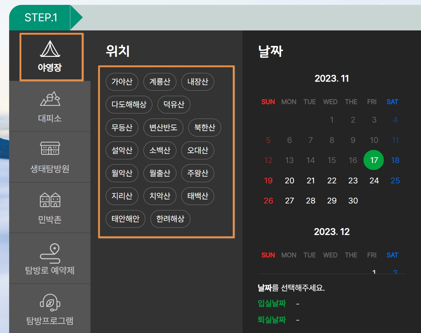 가장 첫번째로는 왼쪽 메뉴에 '야영장' 탭을 클릭해주는 것 입니다. 그래야 예약할 수 있는 국립공원 산들이 나타나기 때문인데요, 내가 가고싶은 산을 클릭하고 날짜를 선택해줍니다.