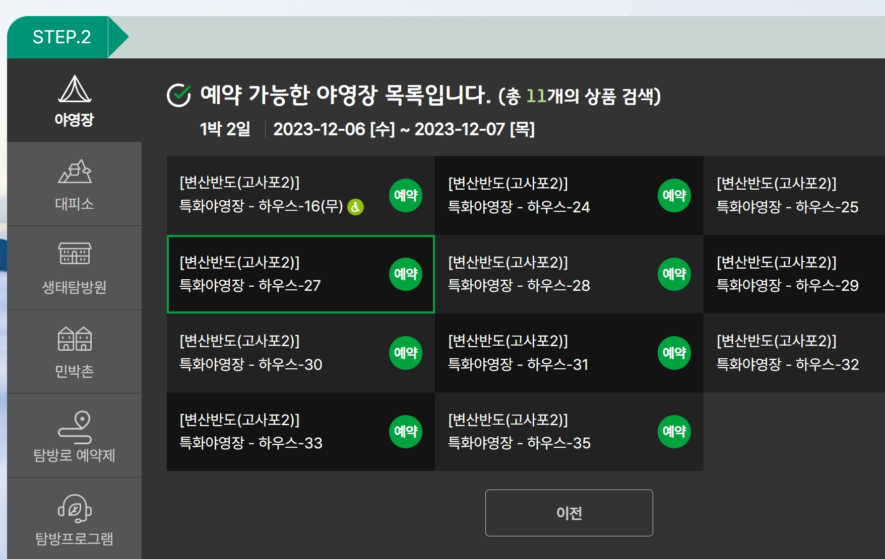 아래와 같이 가능한 야영장 목록의 경우 초록색으로 예약 이라는 글씨가 있습니다. 미리 다녀온 사람들의 후기가 있다면 검색하여 내가 원하는 자리를 미리 체크 후 선택하는 것도 좋을 것 같습니다.