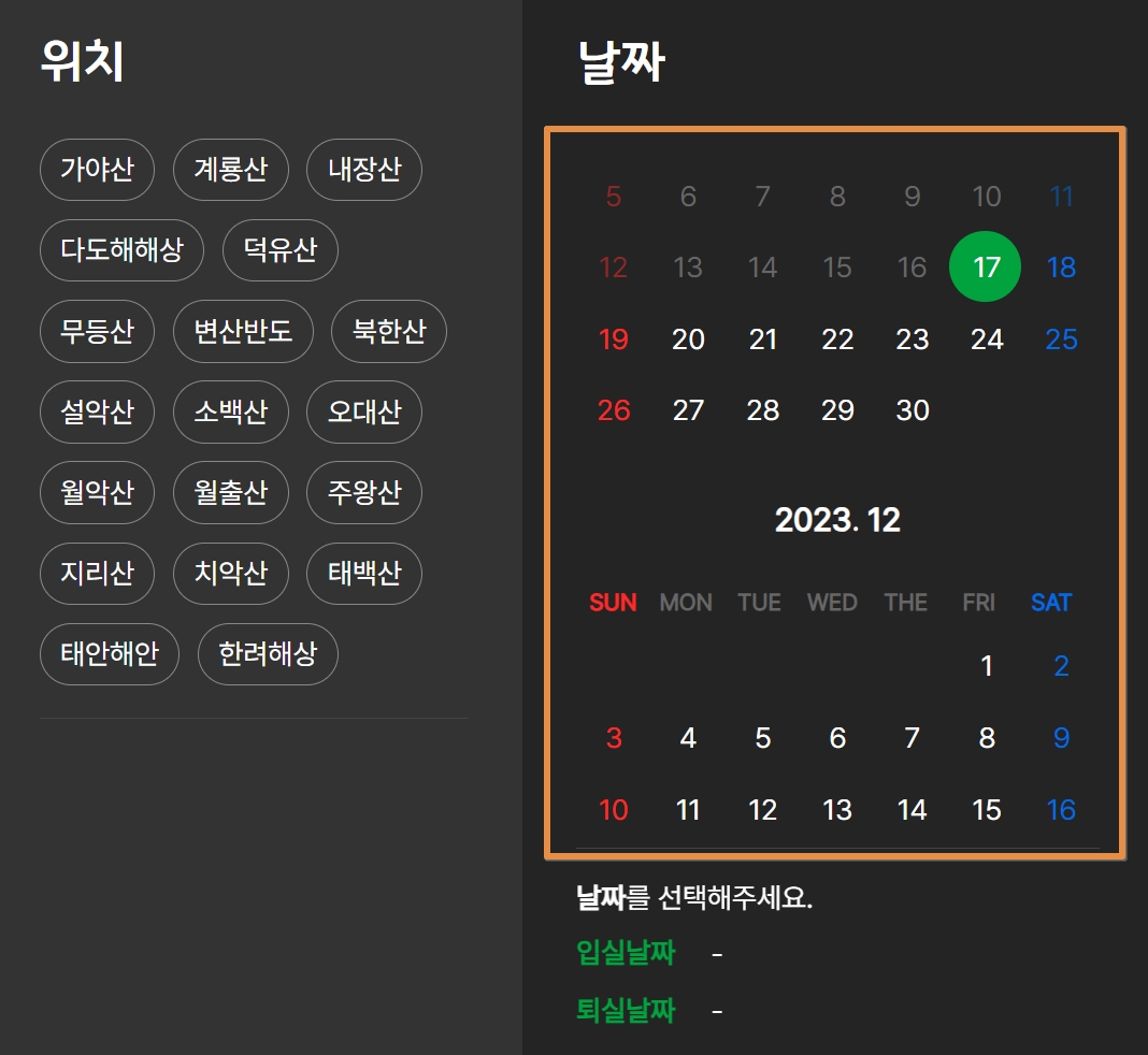 내가 가고싶은 산을 선택하고 야영장이 2곳 이상인 곳이 많으니 이럴 경우에도 꼭 어떤 야영장인지 체크 후 날짜를 선택하셔야 합니다.