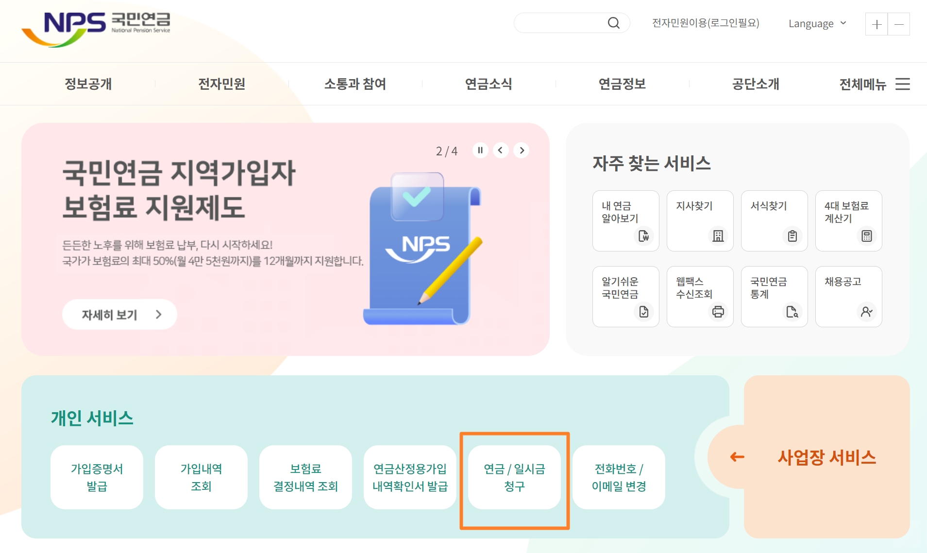해당 홈페이지에서 본인인증을 통해 로그인을 한 다음, 아래 연금 / 일시금 청구 영역을 클릭해주면 됩니다. 매우 간단하게 온라인으로 신청할 수 있습니다.