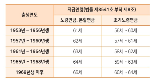 지급 개시 나이는 아래 표를 참고하시기 바랍니다.
