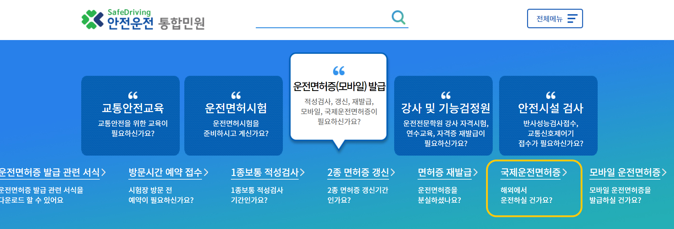 해당 사이트에서 운전면허증 발급 탭을 클릭 하시면 오른쪽 영역 노란색으로 색인되어있는 부분에서 '국제운전면허증'을 신청할 수 있습니다. 로그인 후 절차에 따라 신청해보시기 바랍니다.