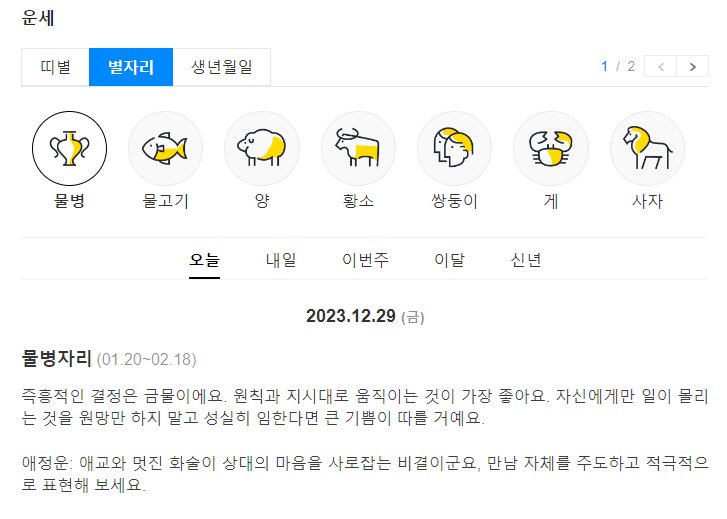 두번째는 별자리 입니다. 우리는 태어나는 시기를 유추해 하늘의 별 자리를 하나씩 갖고있습니다. 여러분은 어떤 별자리이신가요? 내 별자리를 클릭 후 오늘, 내일, 이번주, 그리고 신년 운세를 확인해볼수 있습니다.