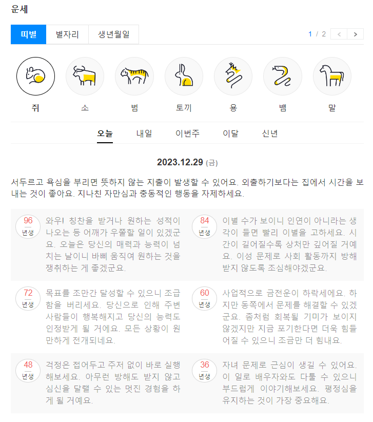 위 버튼 클릭 시 아래와 같이 띠별로 확인해볼 수 있는 운세 서비스를 만나볼 수 있으며, 출생년도에 따른 해설이 함께 나와있습니다.