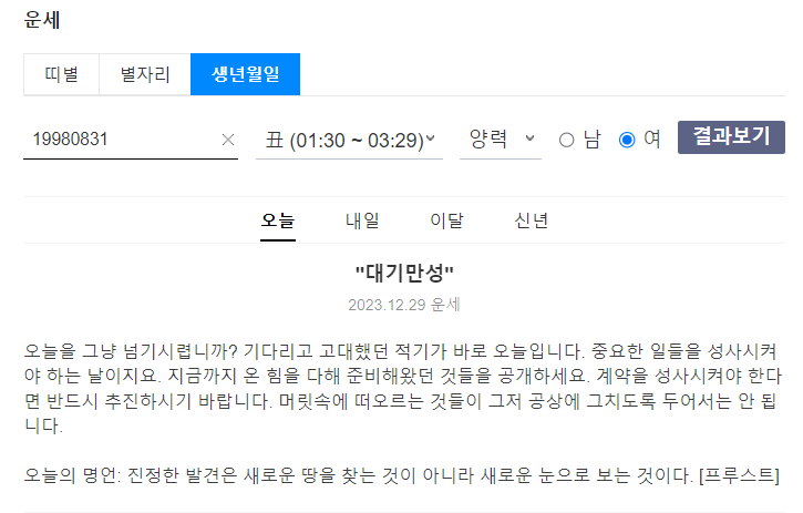 생년월일을 입력 후 결과보기를 클릭했더니 오늘, 내일, 이달, 신년 등의 운세 풀이를 볼 수 있습니다.