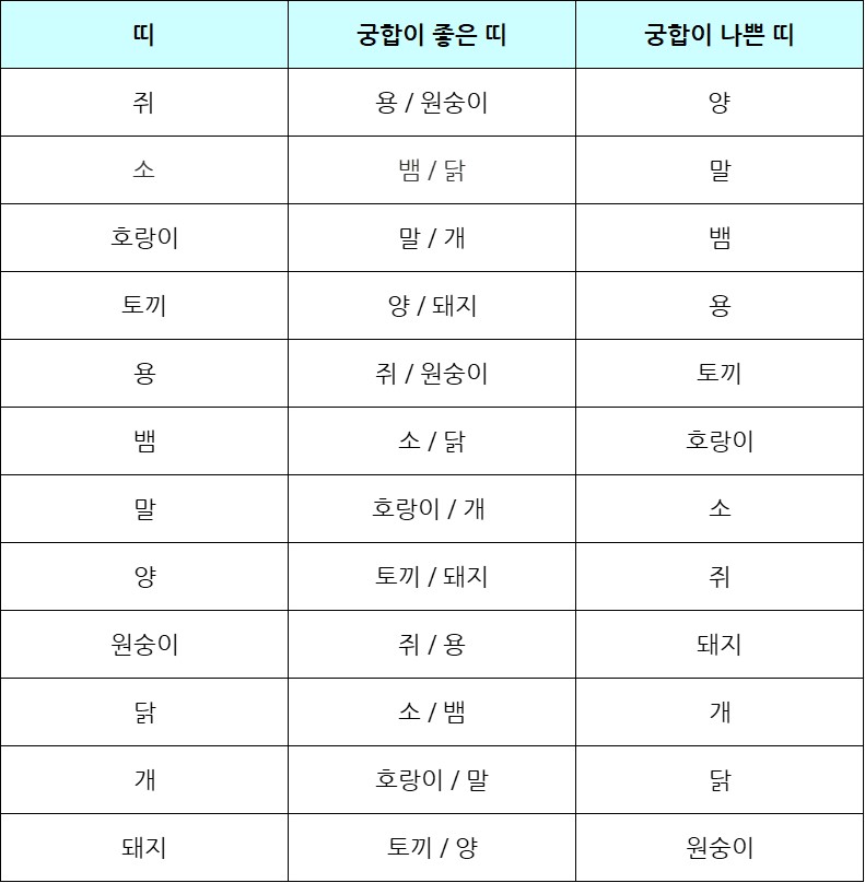 아래 띠별 궁합 표를 참고해보시기 바랍니다.