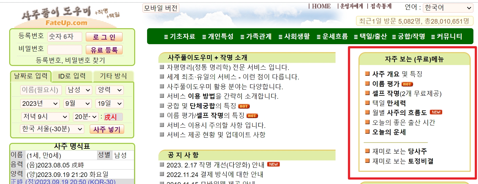 무료 메뉴는 사주 개요와 특징, 이름 평가, 셀프 작명, 택일 만세력, 월별 사주의 흐름도, 오늘의 좋은 출산 시간, 오늘의 운세 등 입니다.