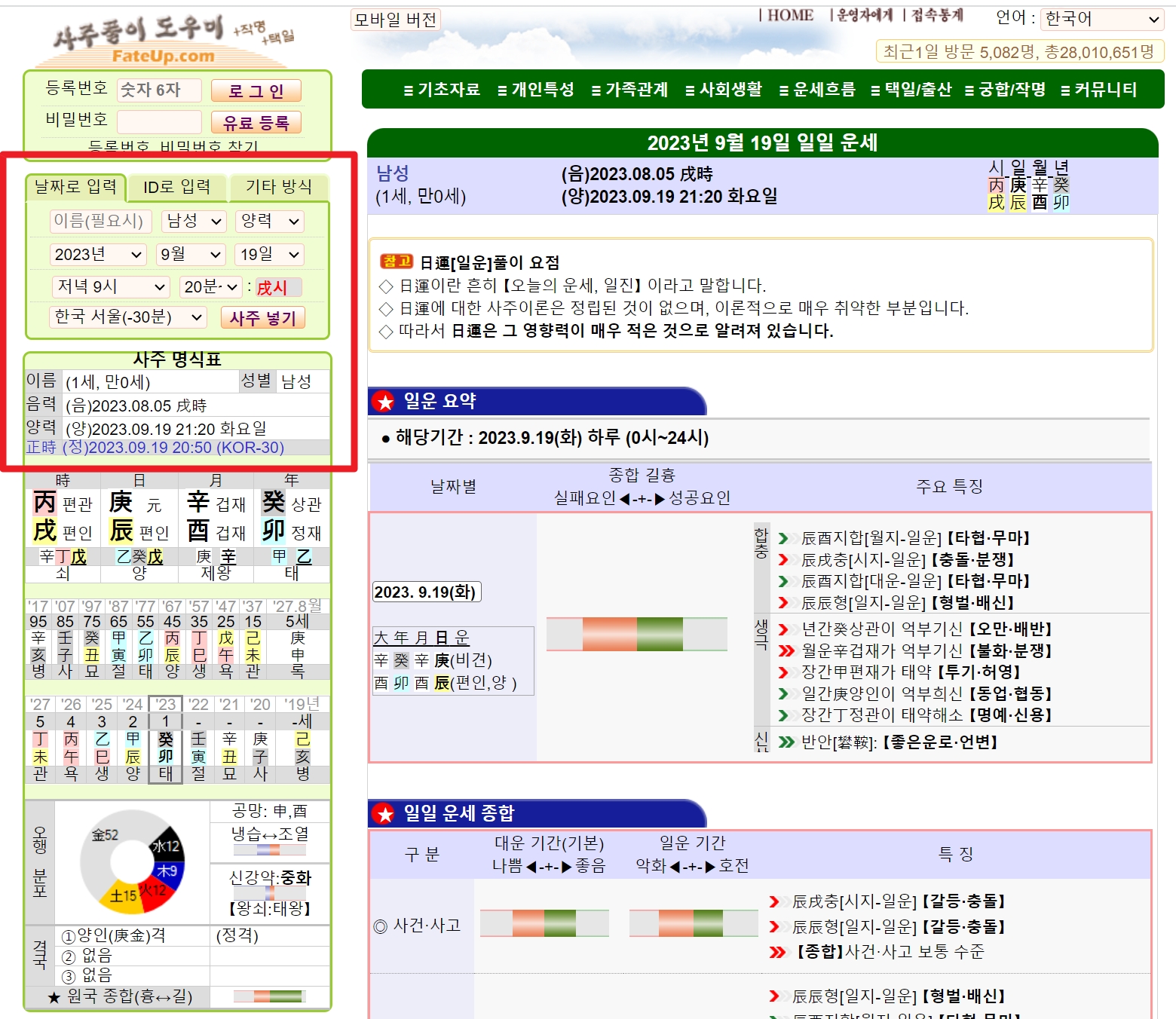 사주풀이 도우미 사이트로 이동하시면 왼쪽 상단에 날짜로 입력이라고 되어있는 곳에 회원가입을 별도로 하지 않아도 입력 후 사이트를 이용할 수 있습니다.