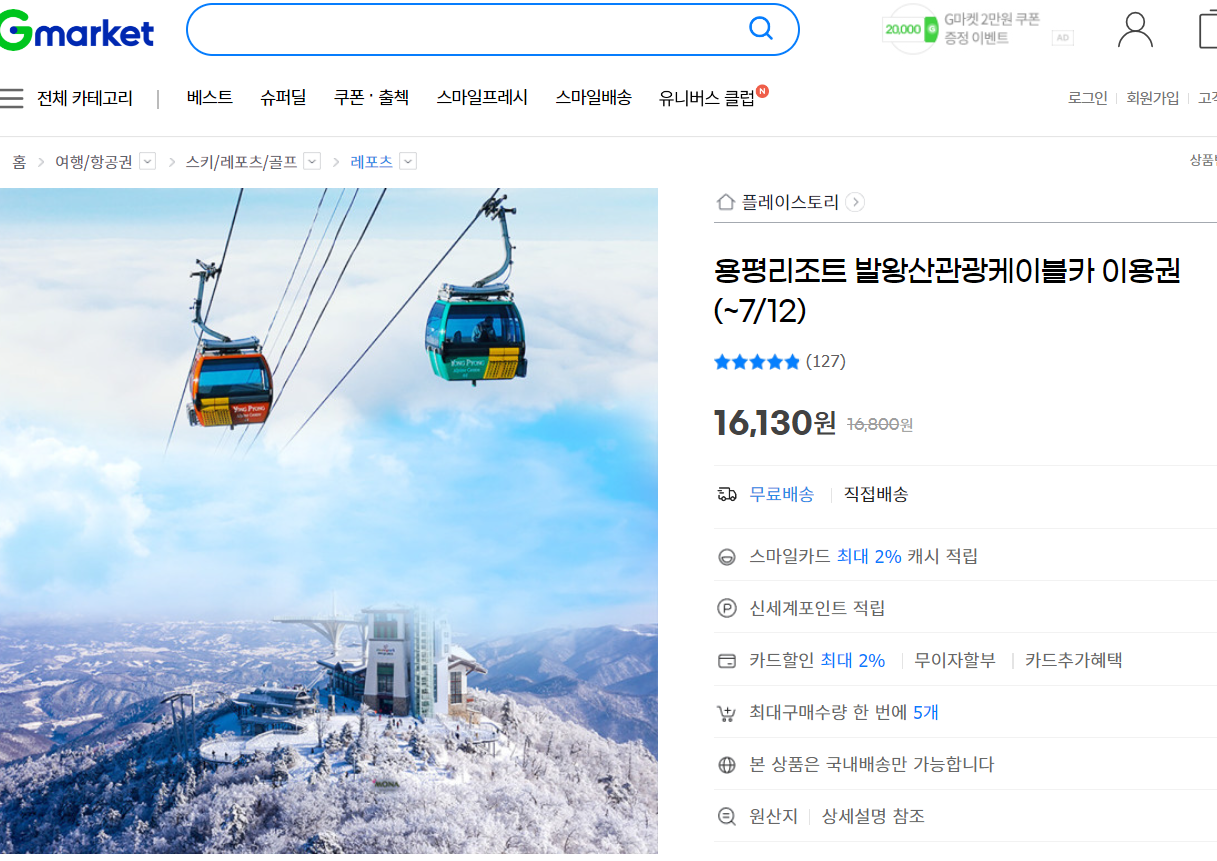 지마켓에서 구매할 수있는 용평리조트 발왕산 케이블카 이용권입니다. 현재 소인의 경우 16,130원에 구매할 수 있으며 대인의 경우 3천원이 추가됩니다.