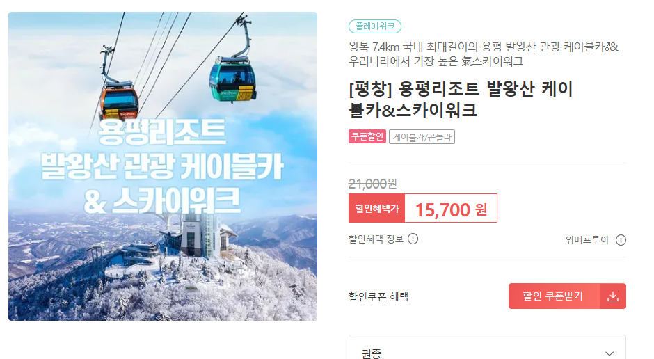 위메프에서도 발왕산 케이블카를 예약할 수 있는 페이지로 이동합니다. 할인 혜택가가 더 저렴한 것을 확인할 수 있습니다.
