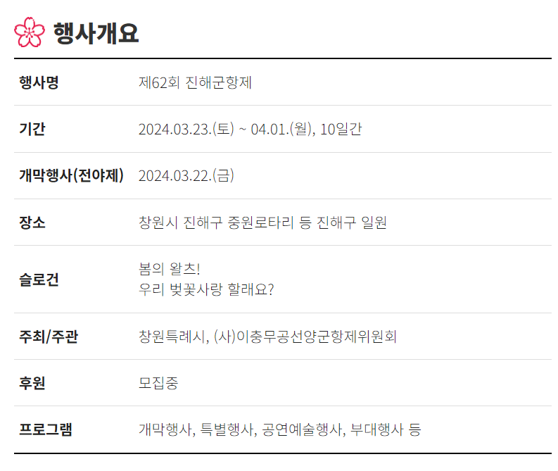 창원 진해군항제는 올해 가장 빠른 시기에 벚꽃 축제를 진행할 예정입니다. 따라서 올해 2024년 3월 22일 토요일부터 열흘간 축제를 개최하는데요, 현재 어떤 프로그램등이 준비될 예정인지 아래에서 확인해보시기 바랍니다.