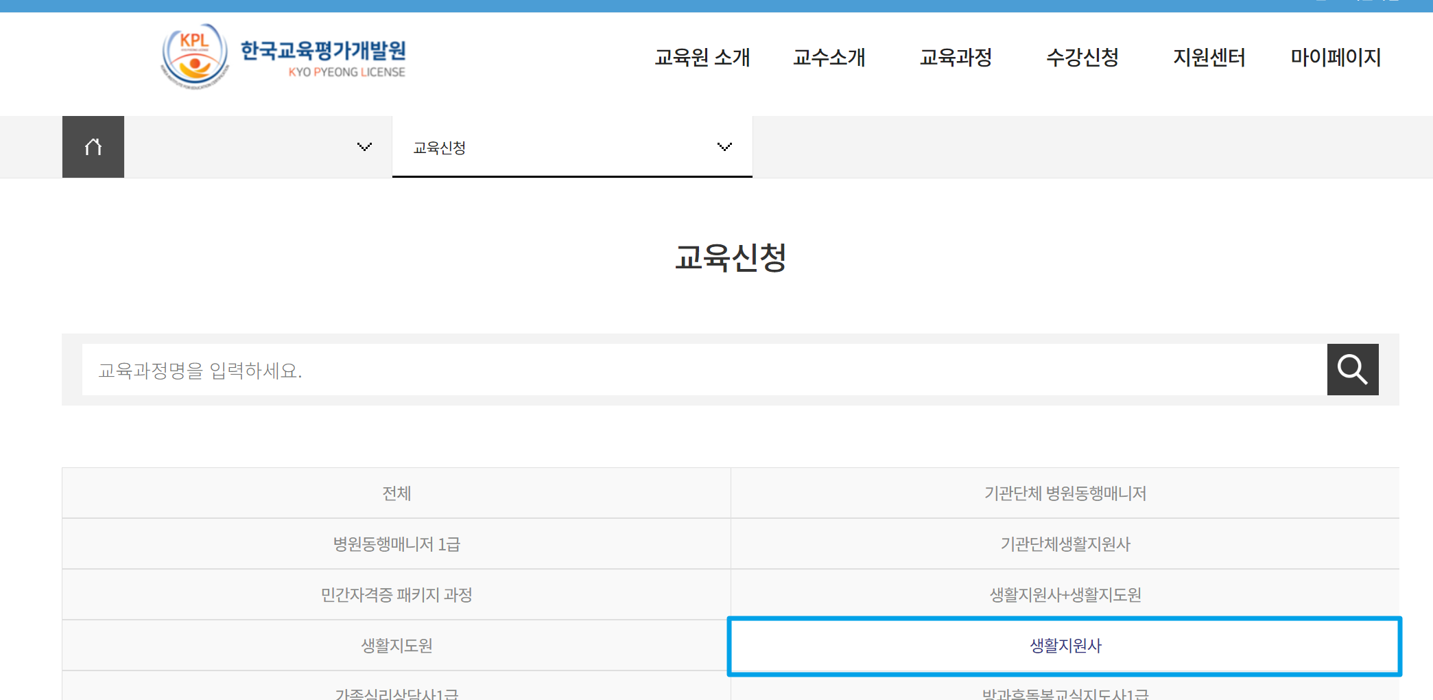 위 버튼을 클릭하시면 한국교육평가개발원으로 바로 이동할 수 있습니다. 여기 페이지에서 생활지원사를 클릭, 하단에 있는 수강을 신청해볼 수 있습니다.