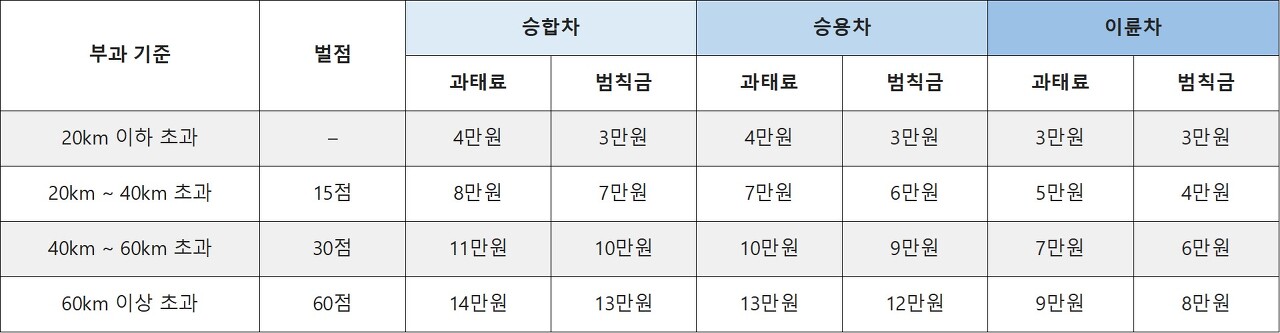 속도위반시 과태료는 아래와 같으며, 범칙금과 비교하여 확인해보시기 바랍니다.