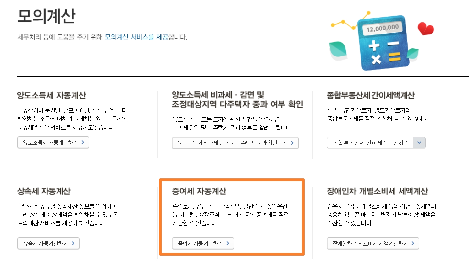 위 버튼을 클릭 후 홈택스에서 세금 모의계산 > 재산세 자동계산 순으로 이동 합니다.