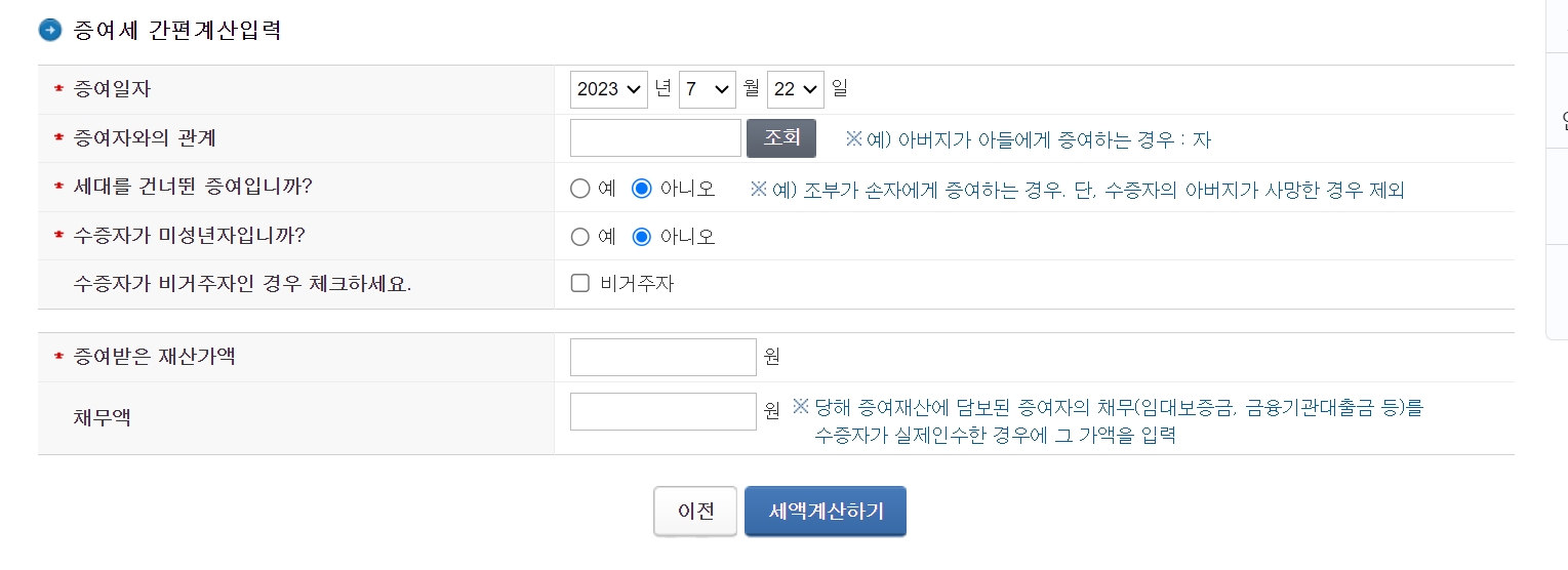증여세 간편계산기를 이용할 경우 아래와 같이 증여일자와, 증여자와의 관계, 세대를 건너 띈 증여인지 여부를 체크 후 세액 계산하기를 클릭시 바로 계산이 완료됩니다.