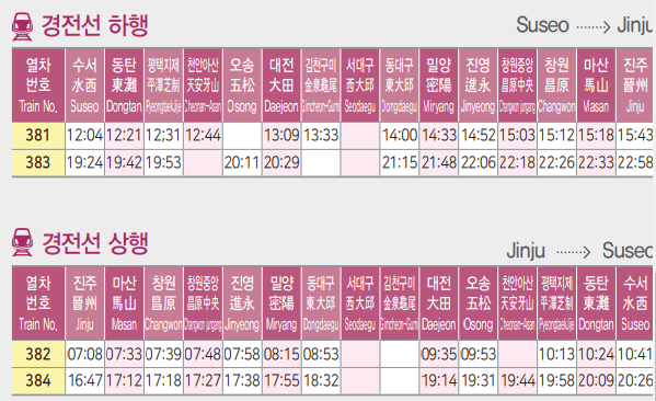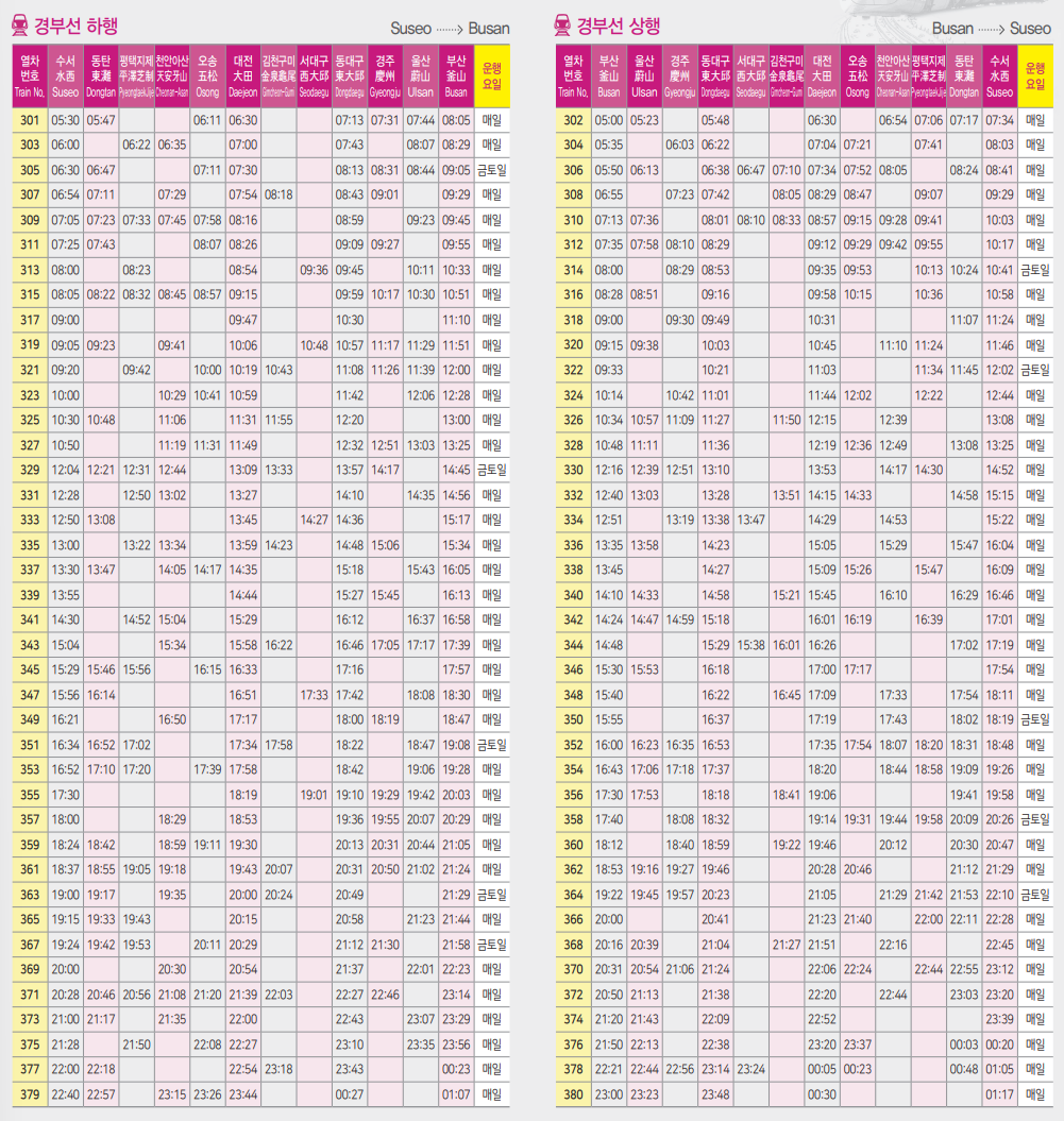 부산을 목적지로 하는 경부선 SRT 시간표 입니다. 상행과 하행 2가지로 구분되며 아래 이미지를 통해 확인해보시기 바랍니다.