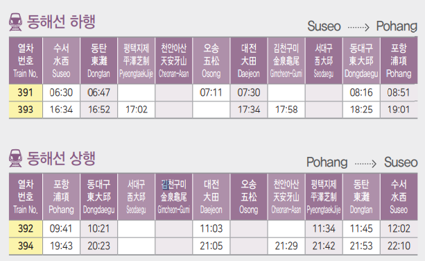 동해선의 경우 평택과 대전을 지나 동대구역과 포항역을 마지막 목적지로 향합니다.