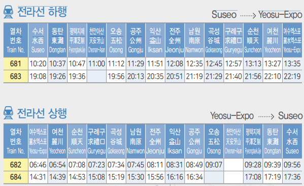 여수 엑스포역이 가장 최종 목적지인 전라선 시간표 입니다.