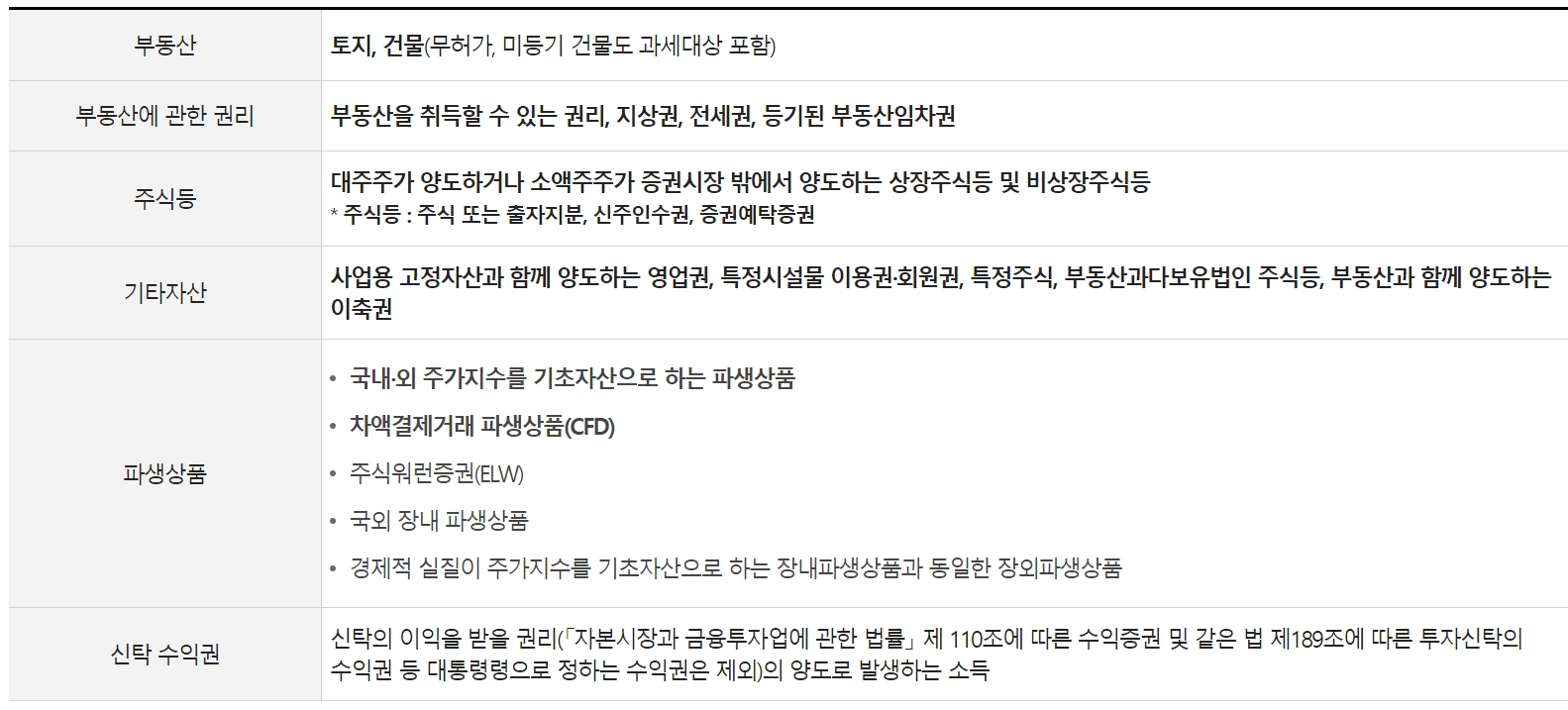 아래 표를 참고하시어 양도소득세 과세대상 자산의 범위를 확인해보시기 바랍니다.
