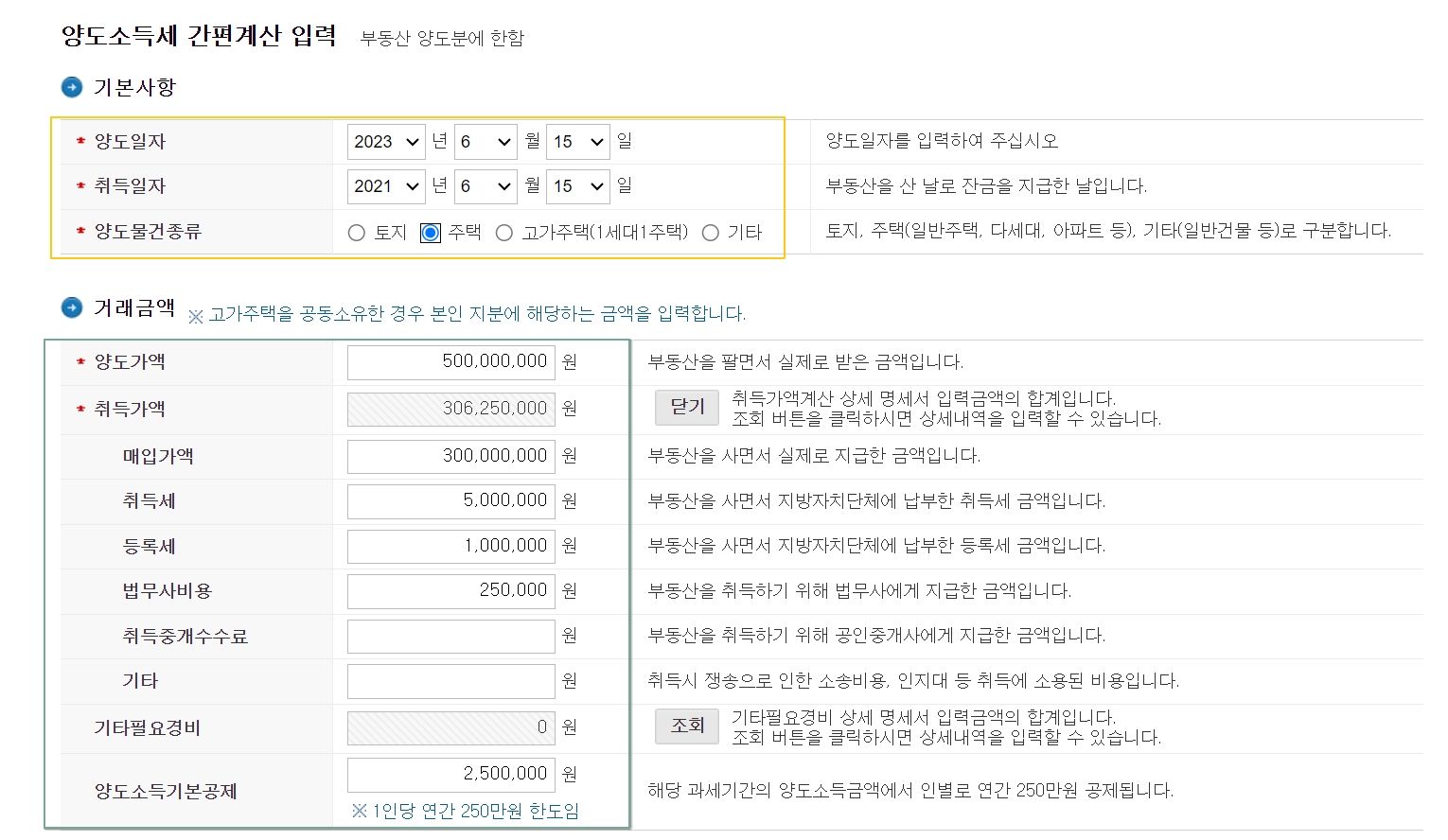 내가 매수한 금액인 취득가액과 취득일자, 그리고 매매한 양도일자와 양도가액 등을 기입합니다. 그 이후에 취득가액에 옆에 열기 버튼을 클릭하여 기타 비용 모두 기입하면 취득가액으로 자동으로 계산됩니다.