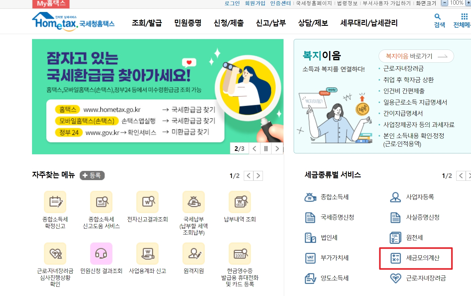 위 버튼을 클릭하면 국세청 홈페이지로 이동됩니다. 페이지를 아래 이미지 박스를 클릭하시어 이동하시면 자가진단할 수 있는 페이지로 이동합니다.