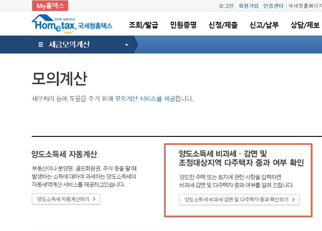양도소득세 비과세 및 중과세 자가진단은 납세자가 스스로 1세대 1주택 비과세, 감면, 비사업용 토지 해당 여부를 판단해 볼 수 있는 서비스입니다.