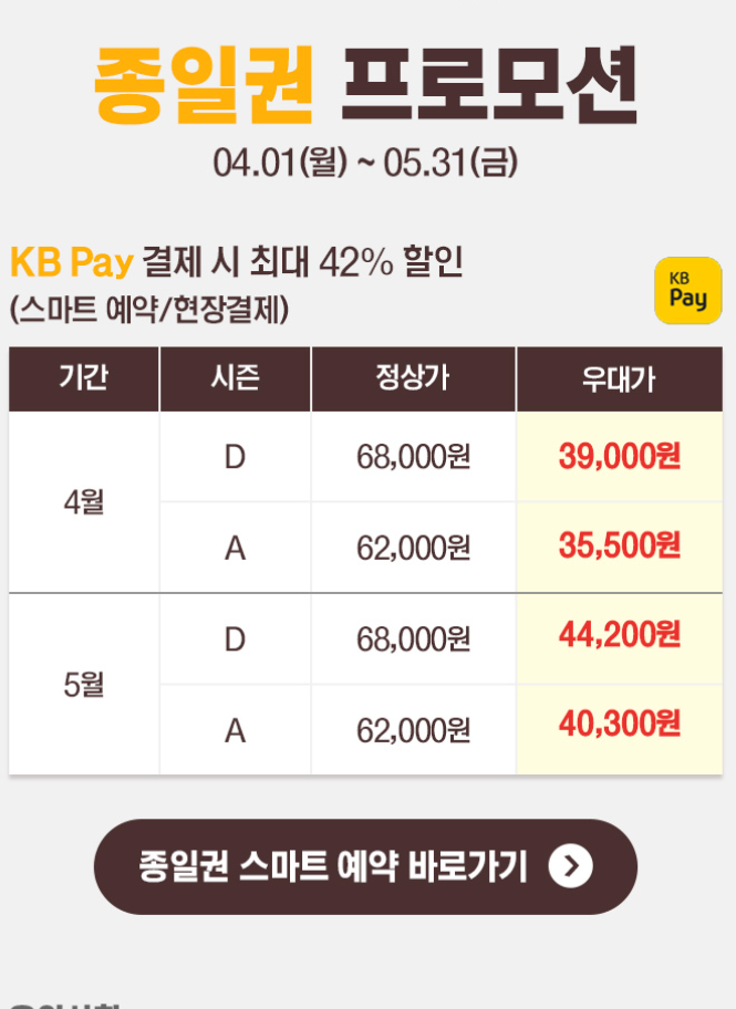 회사마다 어떤식으로 종일권을 구매할 수 있는지 각각 다르기 때문에 꼭 유의사항을 통해 사측의 혜택을 미리 확인하시기 바라겠습니다.