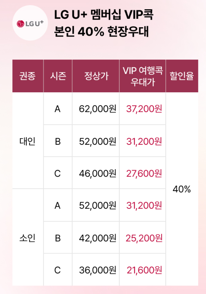 LG 유 플러스의 경우 40% 할인이 가능합니다. 아래 VIP여행콕 우대가를 확인해보시기 바랍니다.