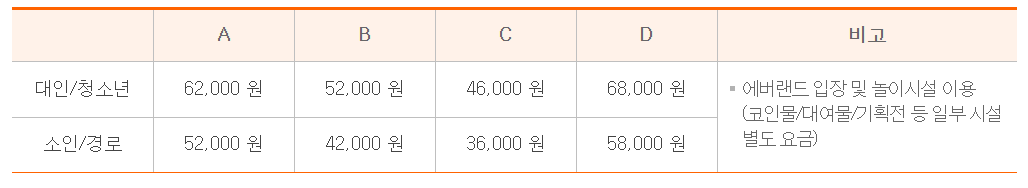 입장료는 입장 시기에 따라 A, B, C, D 로 구분하고 있습니다. 가장 저렴한 시즌은 D인데 보통 주말 요금 + 날씨가 가장 좋은 시기에 높은 가격을 낸다고 생각하시면 됩니다. D가격 > A가격 > B 가격 > C 가격 순으로 형성되어 있습니다.