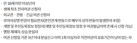온라인 신청은 아래 사유의 경우 신청이 불가합니다. 따라서 아래 내용에 해당하는 경우에는 직접 여권 대행기관에 방문하시어 신청하시기 바랍니다.
