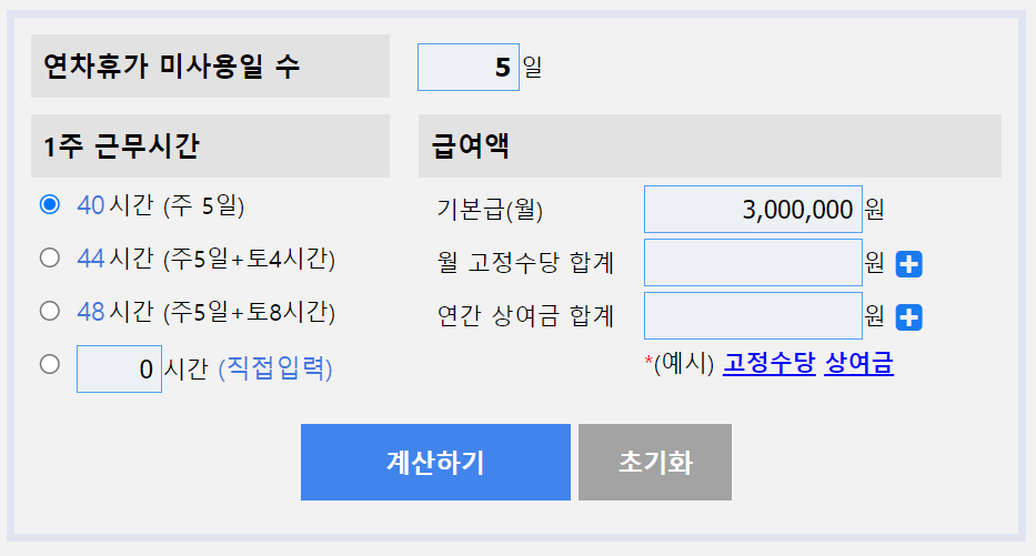 연차휴가 미사용일수를 5일, 그리고 급여액을 매월 300만원으로 설정하여 계산기를 돌려보도록 하겠습니다. 아래 이미지를 확인해주시기 바랍니다.