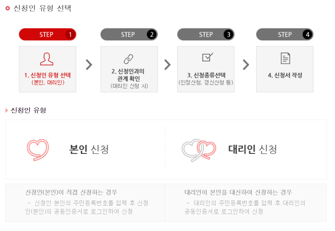 위 버튼을 클릭시 본인신청과 대리인 신청이 가능한데요 신청인에 따라 준비해야 하는 서류가 다르므로 이 점 참고하시어 신청해보시기 바랍니다.