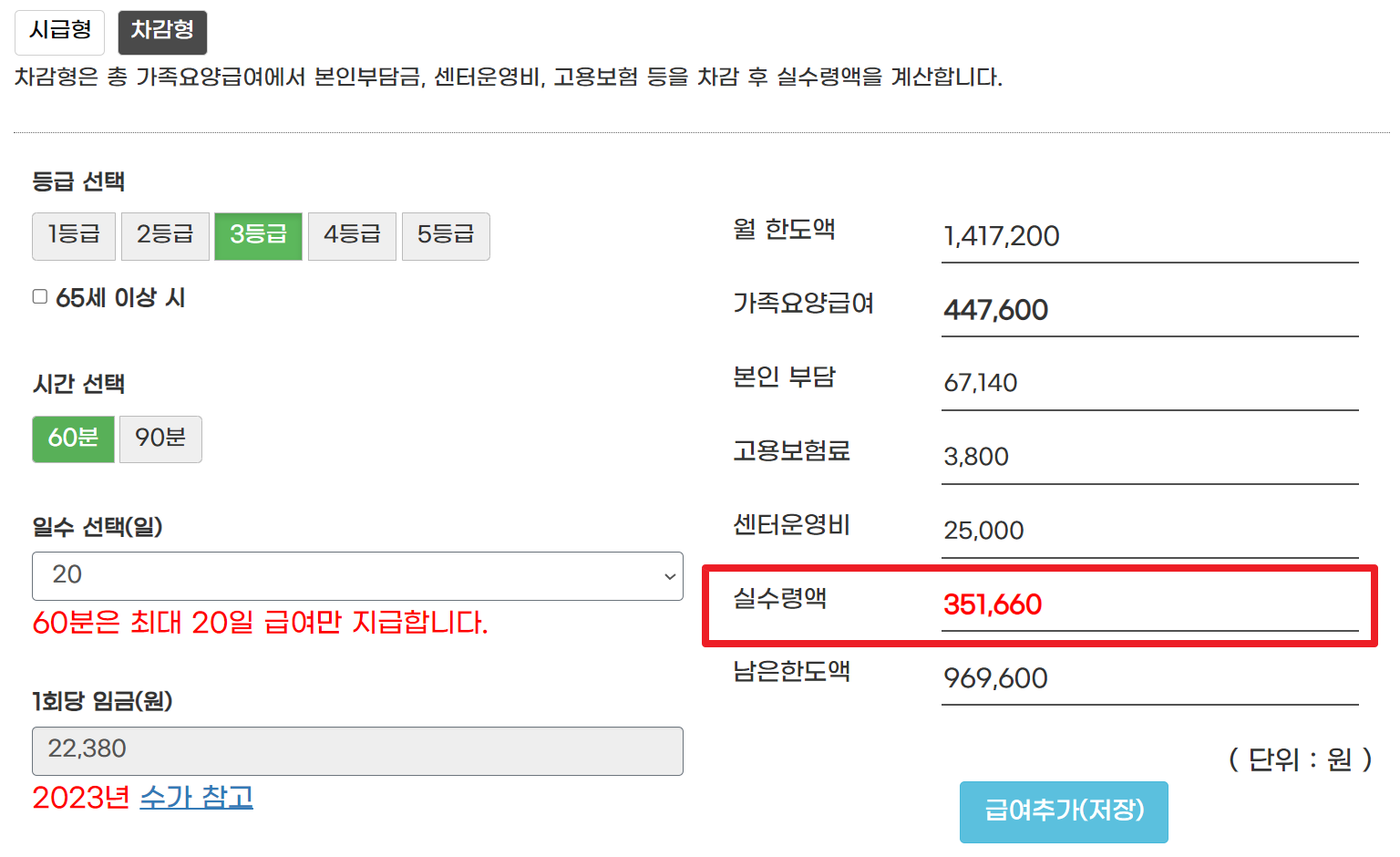 보통 요양 시간에 따라 구분되는데요 사람마다 상황이 모두 각각 다르기 때문에 아래 계산기를 통해 가족케어 급여를 산정할 수 있습니다.