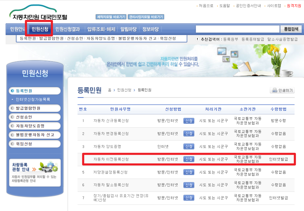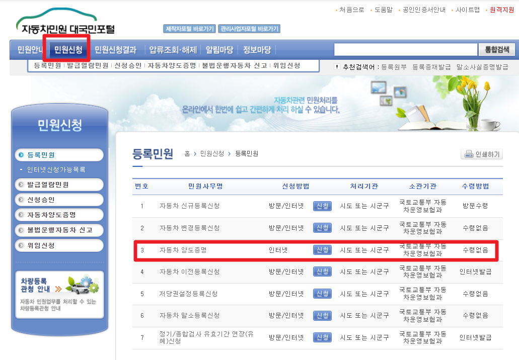 양도인은 차량 앙도증설를 작성하고 양수인은 자동차보 험을 가입해둡니다. 양도인이 자동차 이전등록 신청서를 작성 후 온라인을 통해 내용 입력 후 자동차 양도증명 절차를 완료 시 양수인은 자동차 민원 대국민포털 사이트에서 명의이전을 하시면 됩니다.