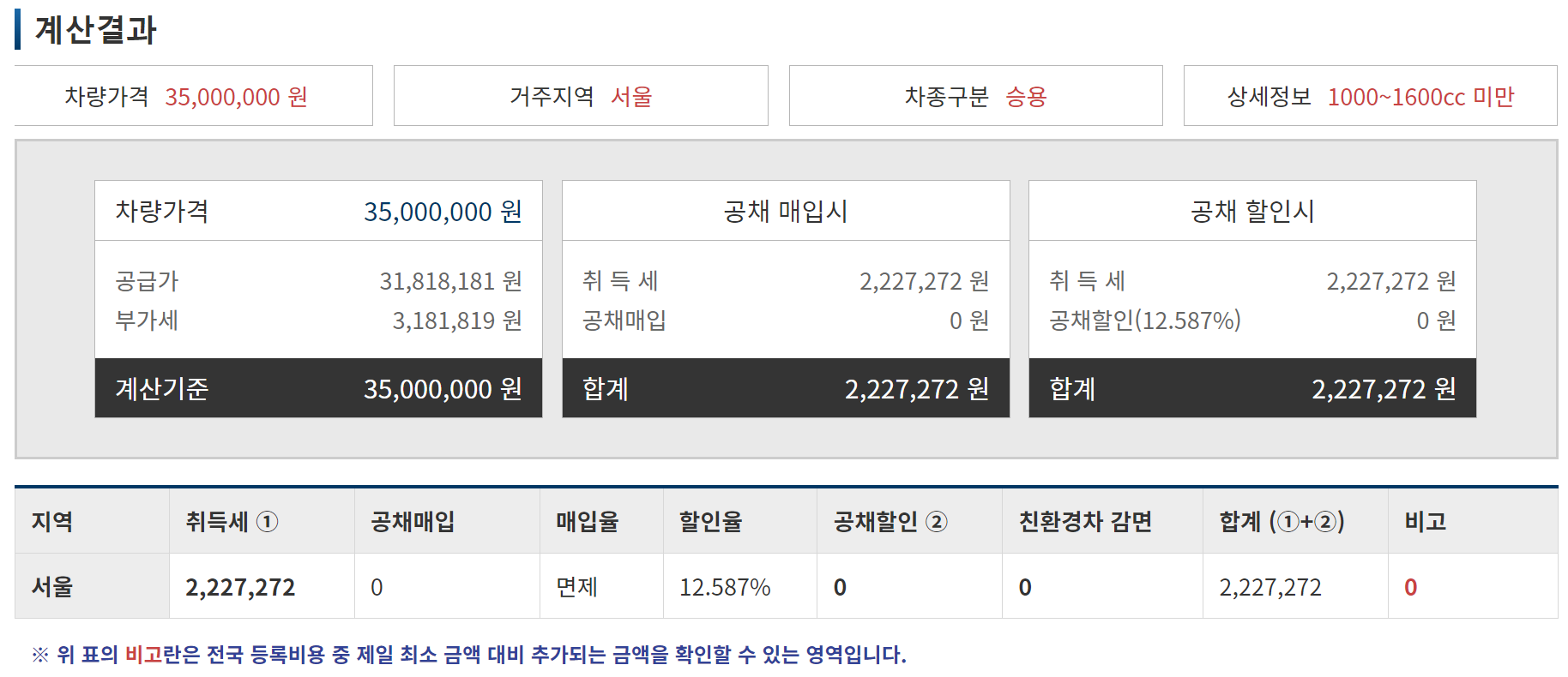 계산 결과를 확인해보시기 바랍니다. 차량가액이 3,500만원 가량이고 거주지역이 서울일 경우 222만원 가량의 취득세가 산정되는 것을 확인해볼 수 있습니다.