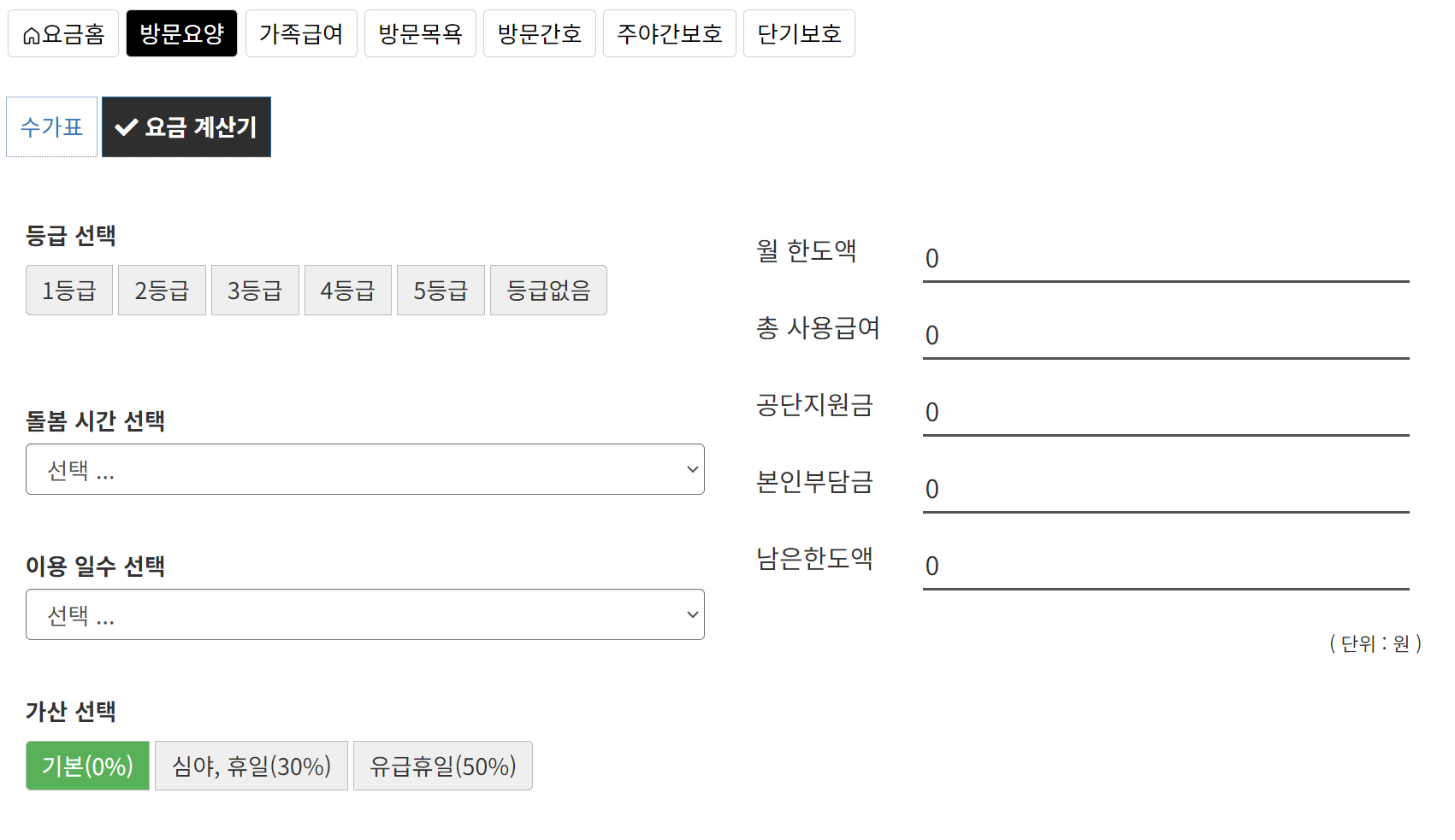 이와 같이 방문요양이라면 방문요양을 클릭 후 등급 선택하여 사용하는 시간과 일수를 선택, 간편하게 계산기를 활용해볼 수 있습니다.