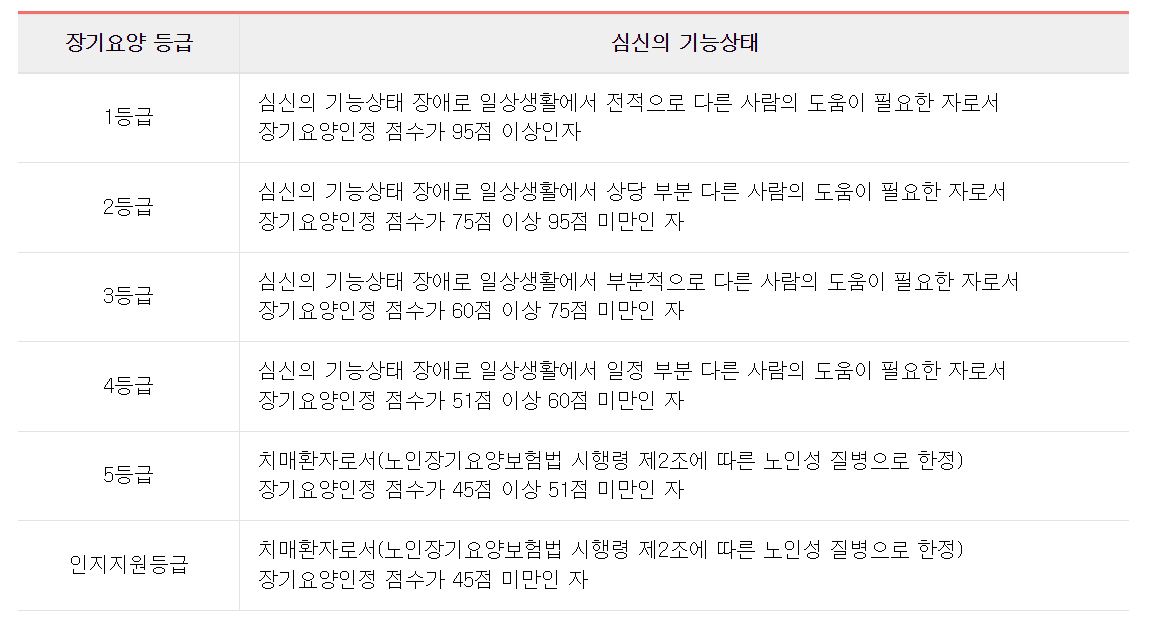 위와같이 등급 판정은 건강이 안좋다, 큰 병에 걸렸다. 등과 같은 주관적 내용으로 판정하는 것이 아닙니다. 실제 공단에서 사람이 나와 등급 판정 표에 따라 심신의 기능 상태를 각각 체크하여 점수로 매겨지게 되는 것 입니다.