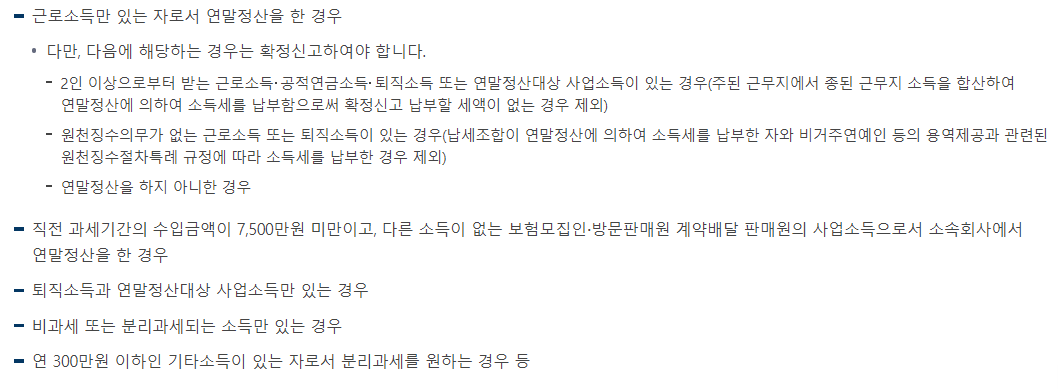아래의 경우에는 종합소득세를 신고하지 않아도됩니다. 근로소득만 있어서 연말정산을 했거나 비과세 또는 분리과세 되는 소득만 있는 경우 등 입니다. 아래 자세한 신고 제외되는 대상자를 살펴보시기 바랍니다.