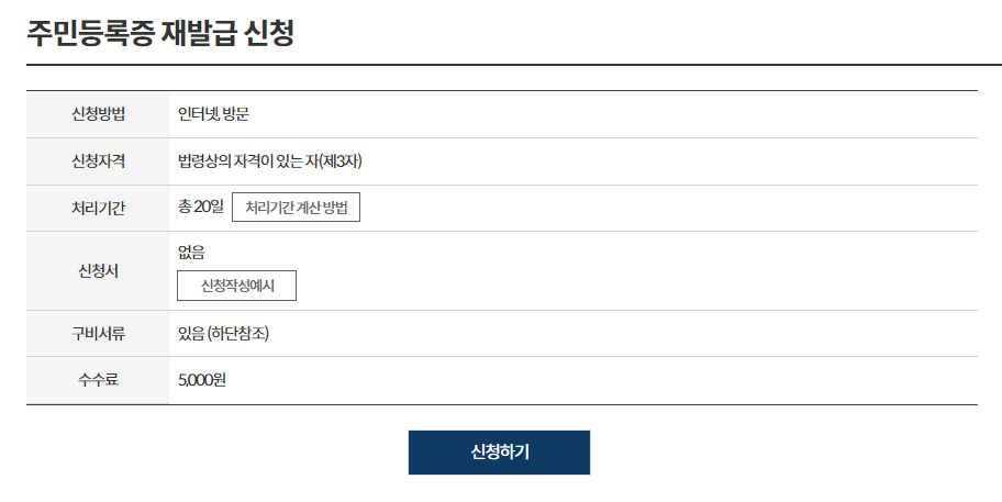 주민등록증을 분실하거나 훼손했다면 위 버튼을 통해 인터넷 발급으로 간편하게 재발급이 가능합니다. 신청시 6개월 이내 촬영한 사진이 필요하고 수수료는 5천원 입니다.
