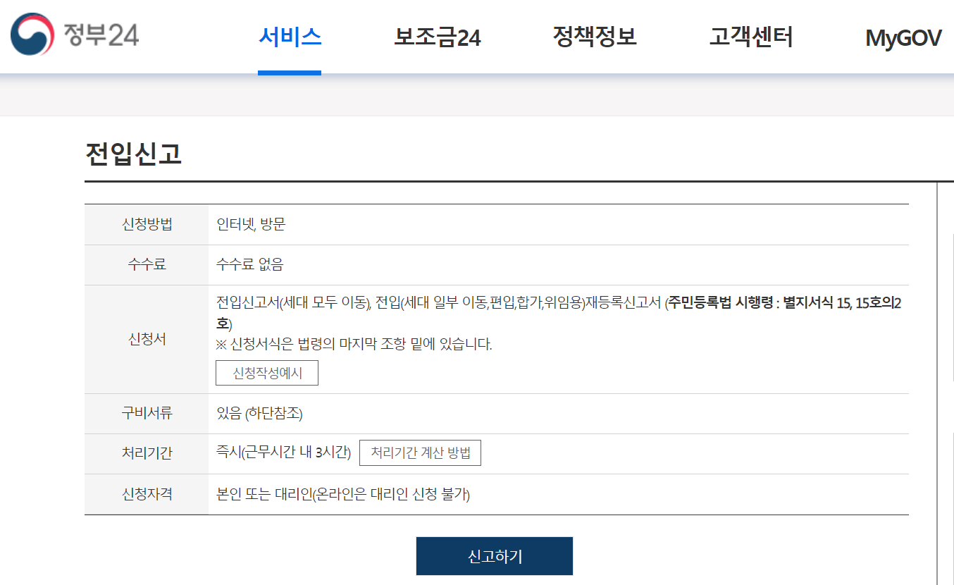 아래 준비해놓은 버튼을 클릭하시면 정부 24 사이트에서 제공하는 전입신고 신청하는 페이지로 바로 이동할 수 있습니다.