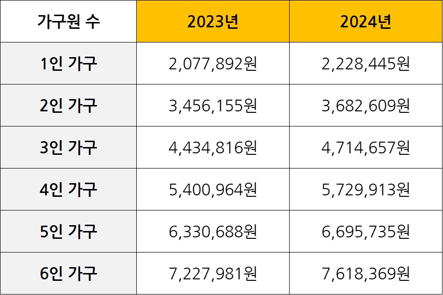 올해 또한 기준 중위소득 100%이 전년도 대비 확대되었는데 2024년도는 6.09% 인상되어 4인 기준으로 5,729,913원이 되었습니다. 이는 4인가구의 소득 평균값이 572만원 가량 된다고 생각하시면 되겠습니다.