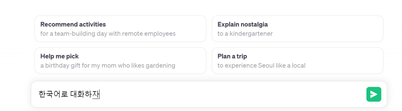 정말 신기하지않으신가요? Chat gpt는 미리 학습되어있기 때문에 자연스럽게 해당 나라의 언어로 대화가 가능합니다.