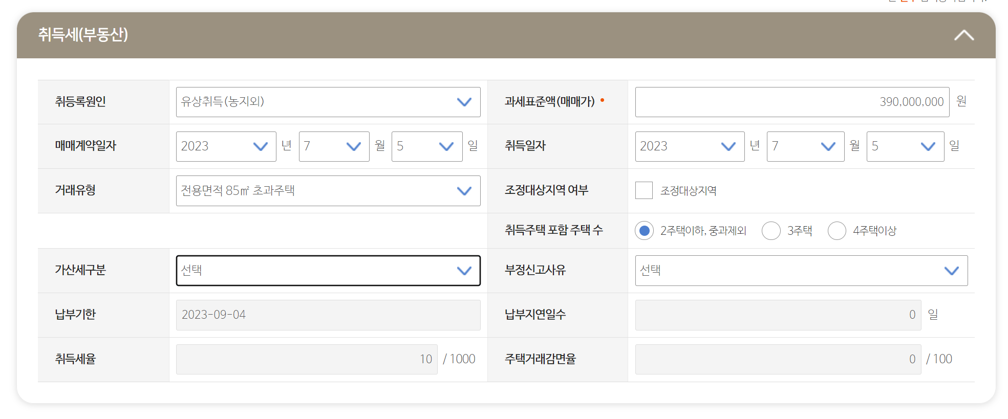 이렇듯 조정대상지역에 있는지 평수는 얼마나 되는지 등 여러가지 유형에 따른 세율을 곱하는 것이 다소 헷갈리신다면 이와 같이 계산기를 이용해보시기 바랍니다.