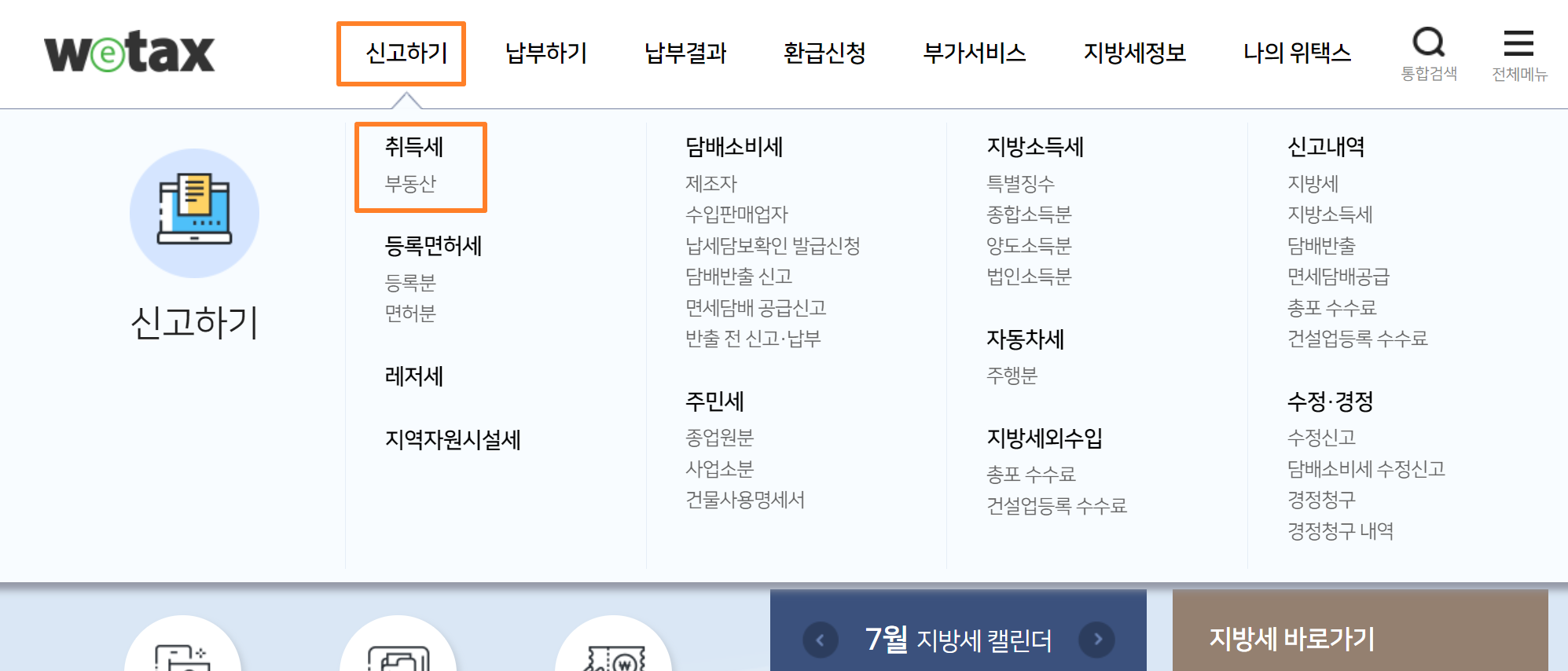 가장 상단에 있는 신고하기 탭에서 취득세를 클릭후 로그인 본인인증 절차를 거친 후에 위택스에 취득세를 신고 및 납부하시면 됩니다.