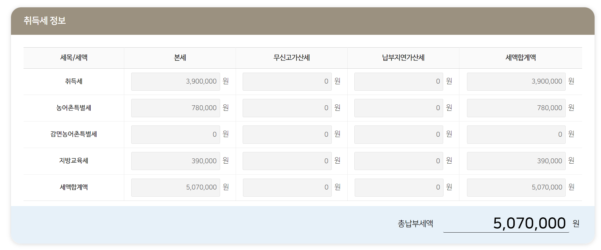 위와같은 내용으로 설정해놓은 후 취득세 세액을 미리 계산해보았는데요 세액은 507만원 가량 산출되는 것을 확인할 수 있습니다.