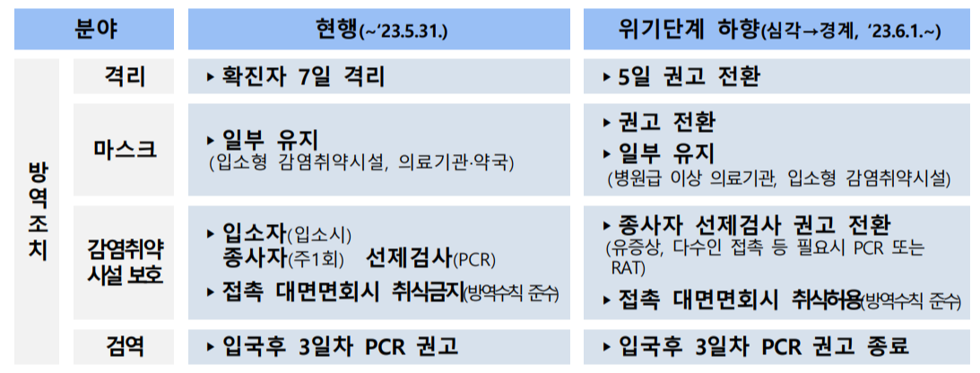 지금까지 확진자로 판정시 7일 격리였던 현행이 6월 1일부로 5일 권고로 전환됩니다.