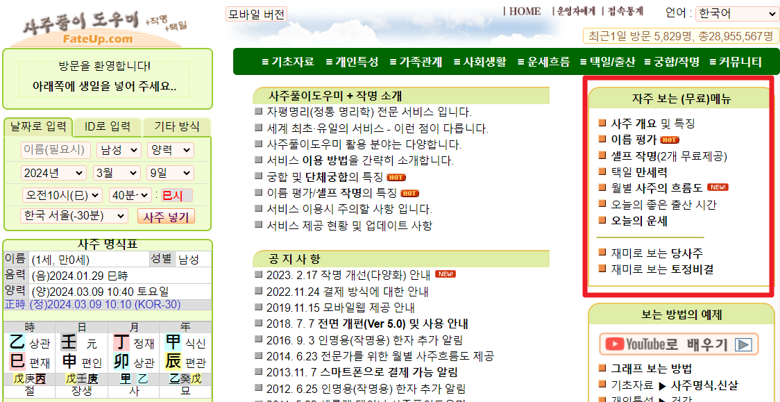이 사이트는 매일 정말 많은 사람들이 찾습니다. 그 이유는 오늘의 운세 뿐 만 아니라 만세력, 토정비결 등을 무료로 제공하는 서비스가 별도로 마련되어 있기 때문인데요,