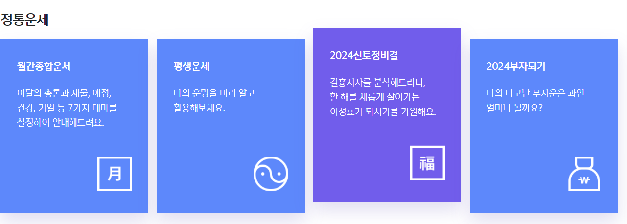 가장 유명한 서비스는 바로 사주풀이를 통해 한 해의 운세를 확인하는 토정비결입니다.